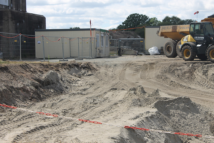 Im westlichen Bereich der Zerschellerplatte des T 750 wurde ein Teilstück weggebrochen und ein "Tunnel" bis etwa einen Meter unter das eigentliche Bunkerfundament getrieben. Hiermit sollte festgestellt werden, auf wieviel Pfählen der Bunker gegründet ist. Die Freilegung von zwei Pfählen reichte dafür wohl zur Berechnung aus. Die Maßnahme soll nach unseren Informationen nötig gewesen sein, um Statikwerte bezüglich des geplanten Überbaues des T 750 zu berechnen. Nach etwa einer Woche wurde die Öffnung dann wieder verfüllt und die zerstörte Zerschellerplatte in dem Bereich neu mit Betonschlemme ausgefüllt. Die eigentlichen Sanierungsarbeiten auf dem Gelände "wandern" nun weiter in Richtung Westen in etwa abschließend mit der westlichen Bunkerwand. Im Oktober sollen die Arbeiten abgeschlossen sein. Auch die verbliebene Fundament-Sohlplatte des Öltanks "Grodenfähre Nord" wurde mittlerweile zerkleinert und abgetragen.