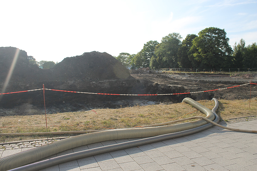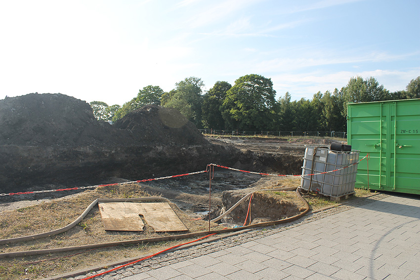 Mittlerweile wurde auch der Gehweg an der Jadeallee abgezäunt. Weitere Mengen Erdreich wurden nordöstlich des Bunkers ausgehoben. Der Tankfundamentbereich ist voll Wasser gelaufen. Es wird sich hierbei um Grund- und Regenwasser handeln.