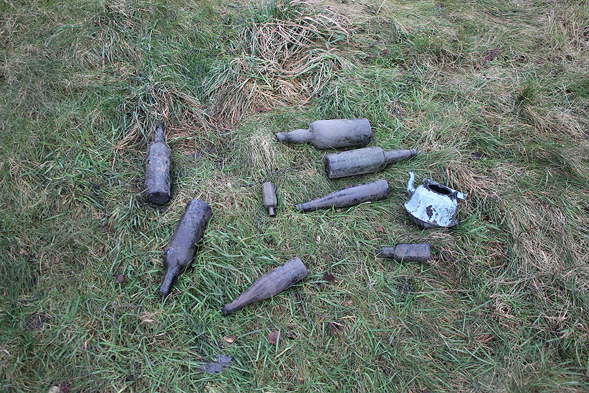 Erste Maßnahmen. - Sondierungen nördlich des Bunkers. Hier befindet sich noch immer die Sohlplatte eines ehemaligen Öltanks im Erdreich. Diese wurde ansatzweise freigelegt und eine Kernbohrung ist durchgeführt worden. Später wurde das Loch wieder verschlossen. Bei den Grabungen sind historische Dinge, darunter Jahrzehnte alte Flaschen ans Tageslicht gelangt... Zum Thema "Flaschen" äußern wir uns allerdings nicht weiter.